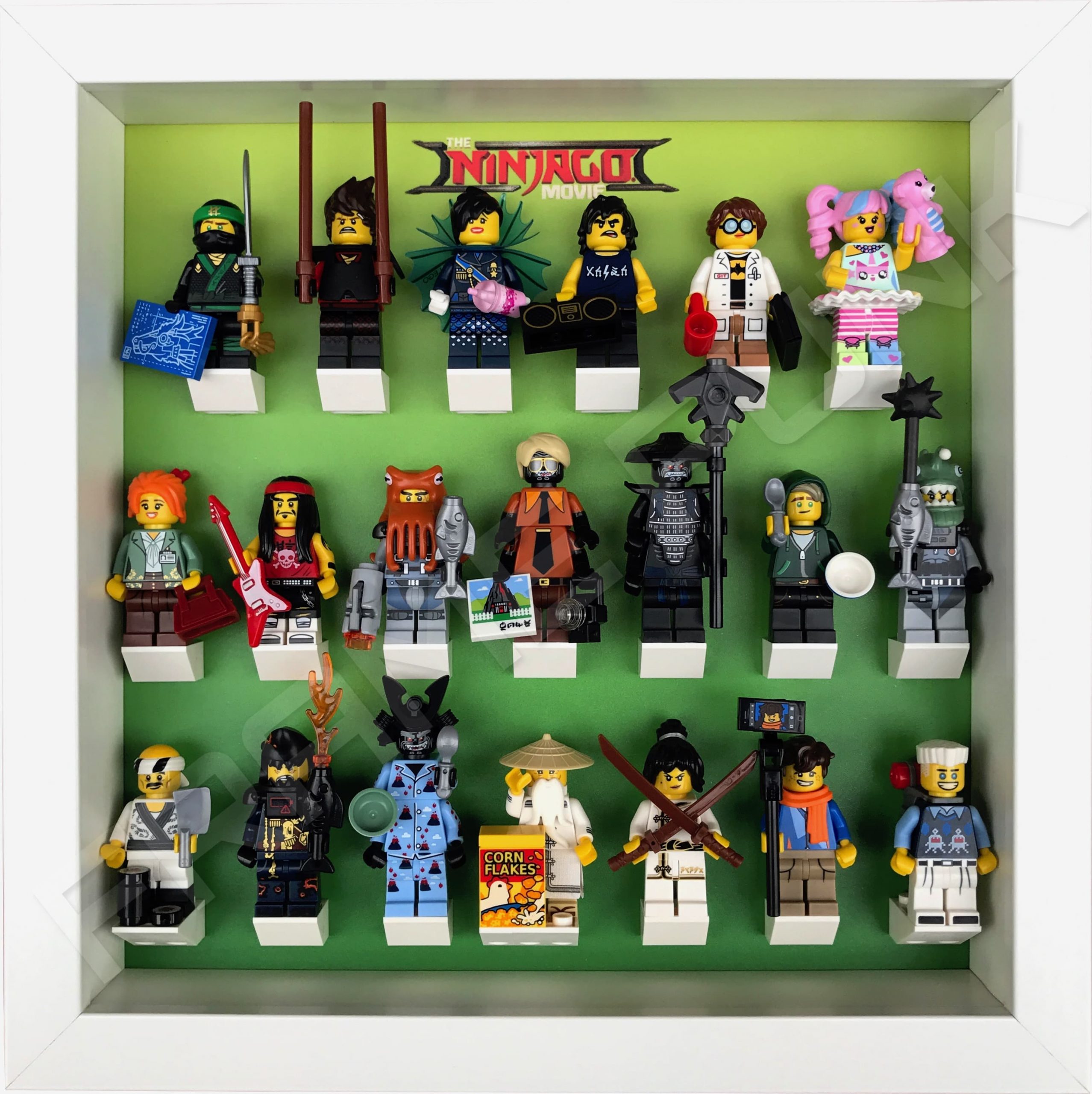LEGO Ninjago Movie Minifigures Series display frame (green fade) with minifigures